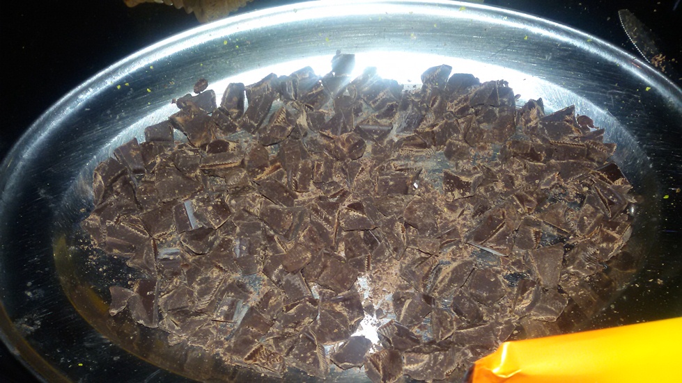 اذا كانت الشوكولاتة المستعملة هي لوح كامل يقطّع الى قطع صغيرة بحجم حبة الحمص ثم توضع جانبا"